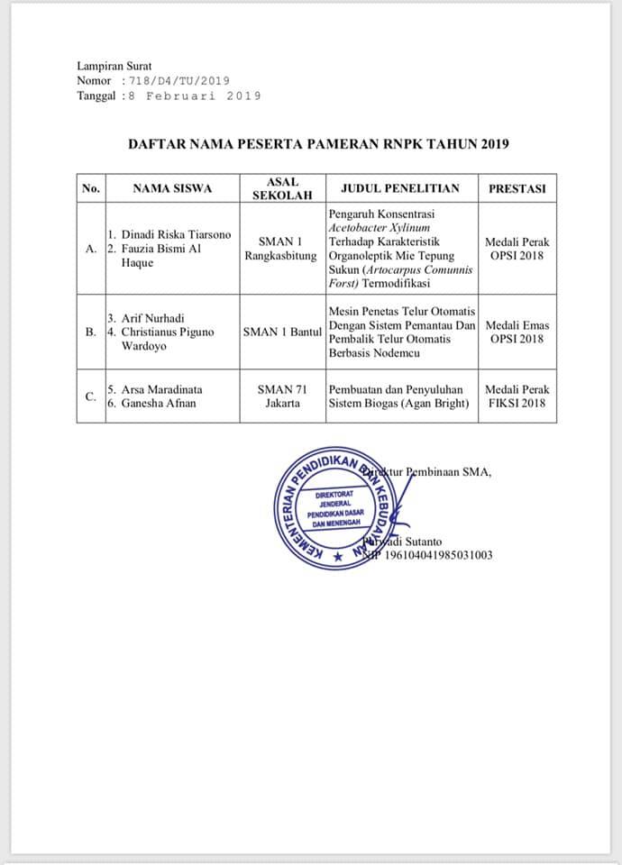 Siswa SMANSA Rangkasbitung, Dinadi&Fauzia, Pemenang OPSI 2019, diundang menjadi peserta Pameran pada acar Rembuk Nasional Pendidikan dan Kebudayaan RNPK 2019 di Bogor 10-14 Feb 2019, Semoga pengalaman ini akan menguatkan keberangkatan nya mewakili Indonesia dalam ajang Lomba Penelitian Internasional di Arizona AS.